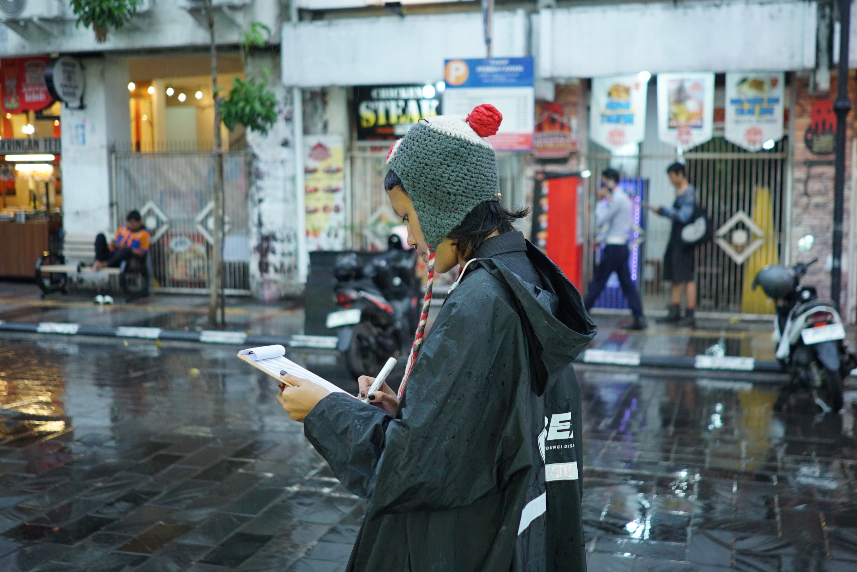 // Find a space where people (or creatures) are moving—maybe a busy street, a park, or a café.