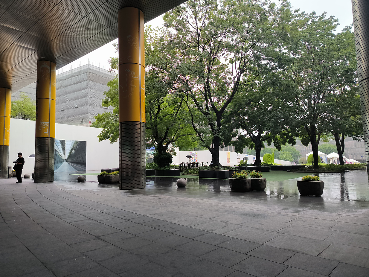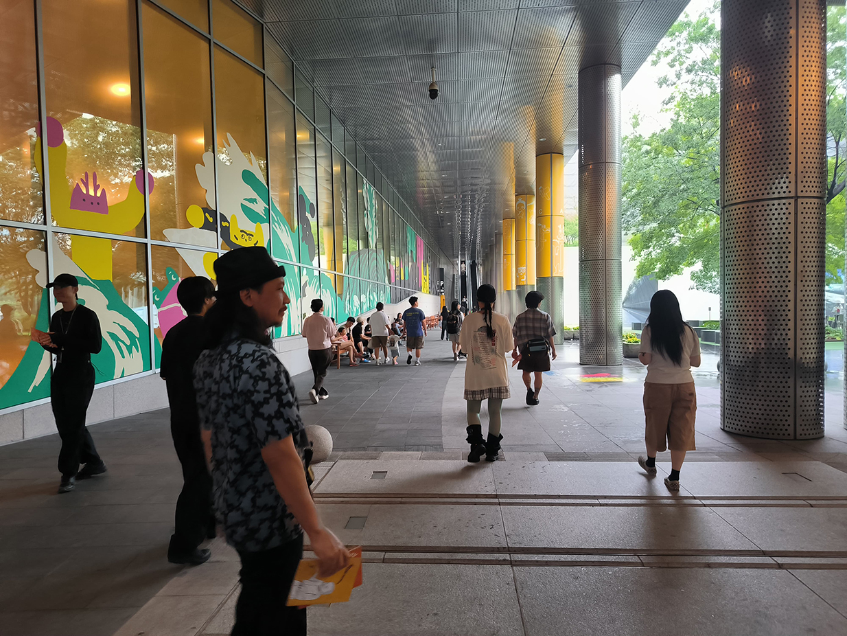 Phase 1 of Sensewalking Flux unfolded in the outdoor corridor near the ACC Children’s entrance. A light afternoon rain redirected our planned outdoor walk into this sheltered space, which unexpectedly became a rich site for sensory exploration. The corridor was lively because it was the weekend; families moved in and out, and children ran past with a mix of laughter, shouts, and hurried footsteps. What could have been a simple transition area turned into a dynamic environment shaped by weather, movement, and chance encounters.