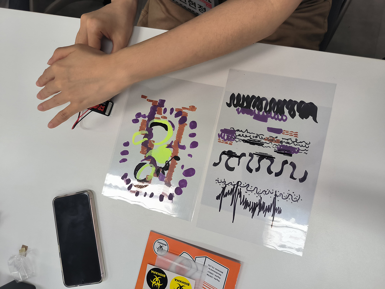 Many participants were fascinated by the system itself. They repeatedly asked what caused the sound to change and discovered that the primary influence was light intensity. This led them to experiment with different methods of blocking, shaping, and filtering light. Some placed their graphic scores directly over the photoresistor, treating the drawings as visual filters for sound. Others moved their hands like performing musicians, creating rhythms with shadows.