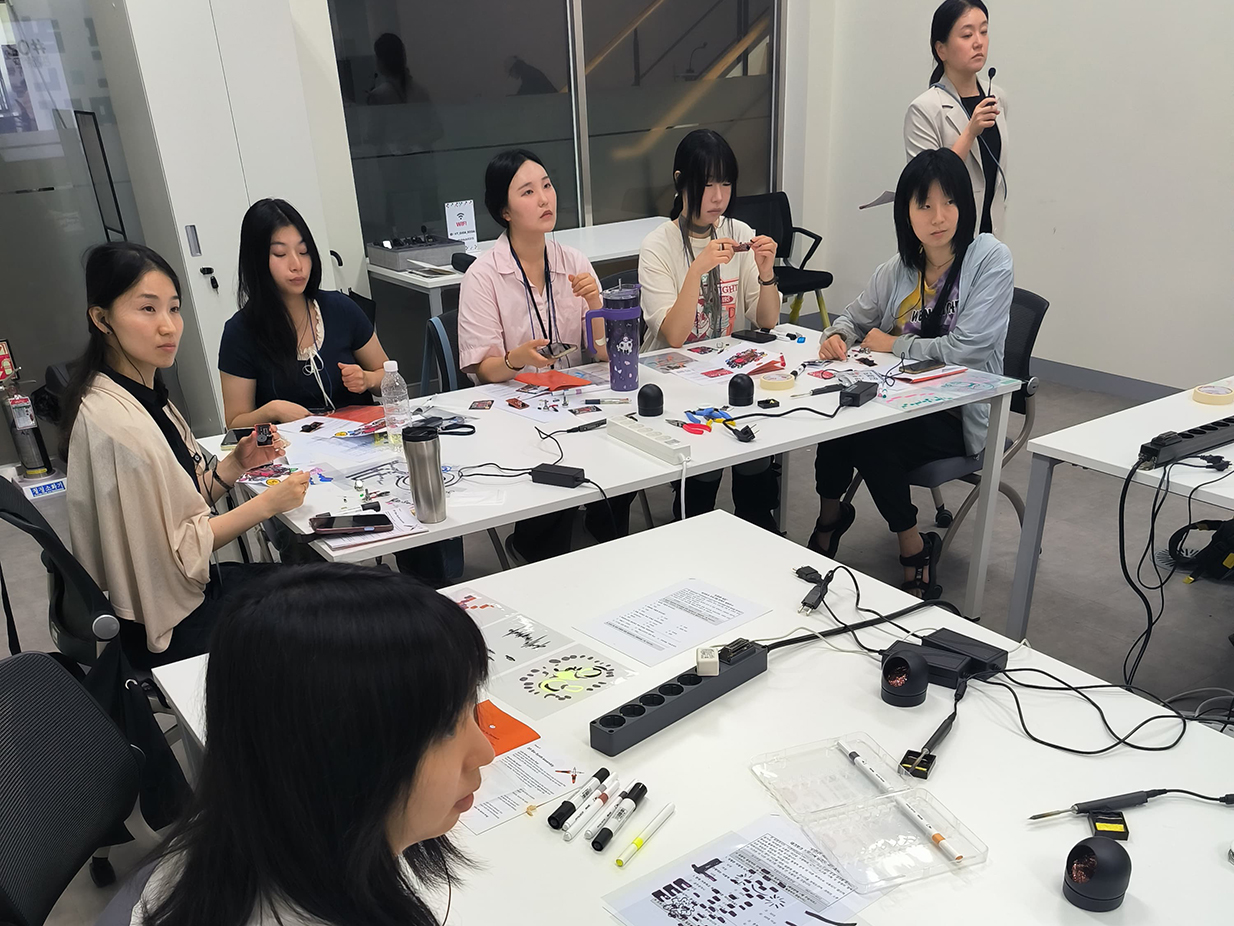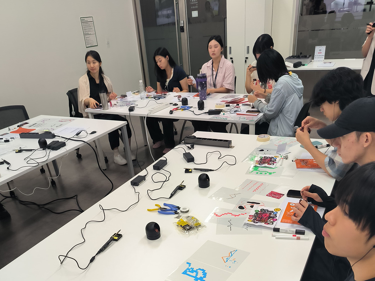 In Phase 2, the energy of the group shifted from quiet observation to active experimentation. Participants gathered around the tables with their graphic scores and DIY bio-synth kits, excited to translate their earlier sensory impressions into sound. Many were curious about how the synthesizer worked. They asked questions about the role of the IC, how the circuit responded to light, and how the module could be expanded or modified in the future.